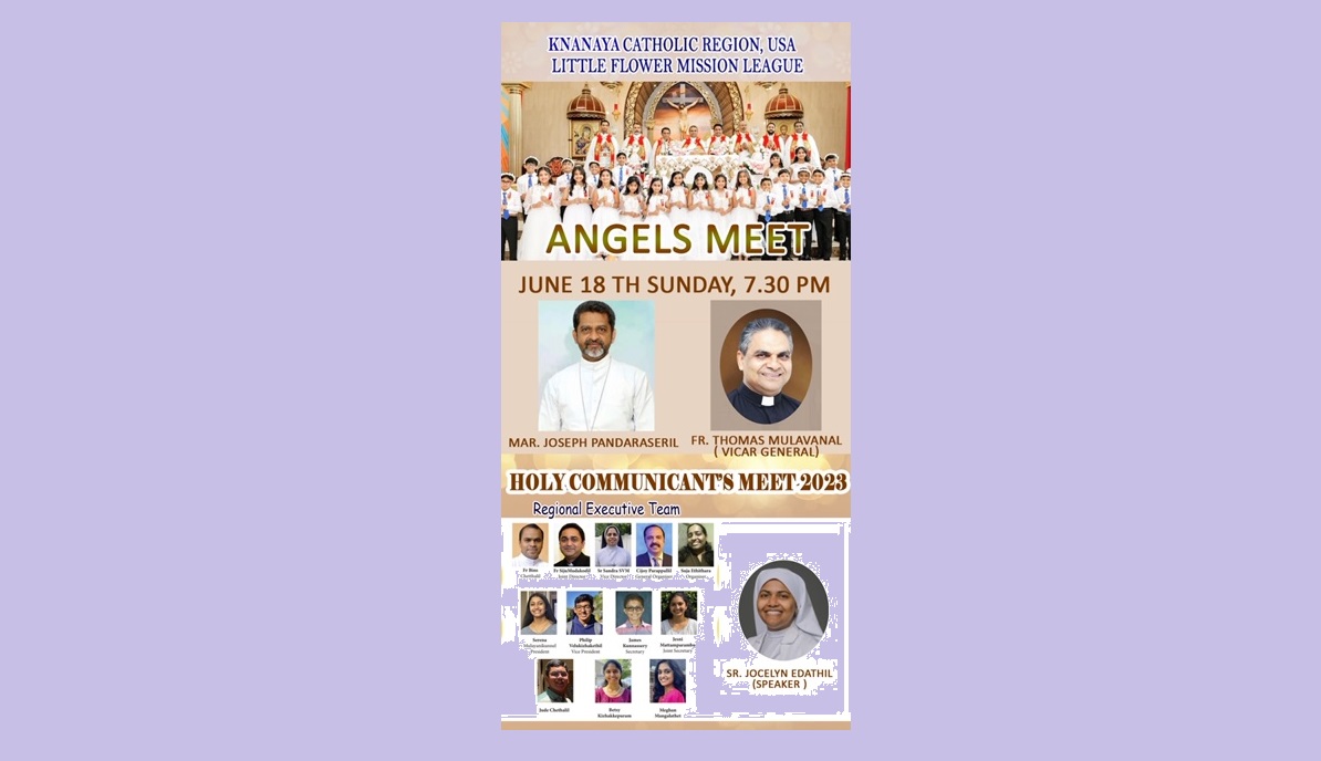 ക്നാനായ റീജിയൺ ചെറുപുഷ്പമിഷൻ ലീഗിന്റെ നേതൃത്വത്തിൽ എയ്ഞ്ചൽസ് മീറ്റ് സംഘടിപ്പിക്കുന്നു.ക്നാനായ റീജിയണിലെ ഇടവകയിലും മിഷനിലുമായി ഈ വർഷം പ്രഥമദിവ്യകാരുണ്യം സ്വീകരണം നടത്തിയ എല്ലാം കുട്ടികളുടെയും സംഗമം സൂം വഴി പ്രത്യേകം നടത്തപ്പെടുന്നത്.കോട്ടയം അതിരുപത സഹായമെത്രാൻ മാർ ജോസഫ് പണ്ടാരശ്ശേരിൽ സംഗമം ഉദ്ഘാടനം ചെയ്യും.ക്നാനായ റീജിയൺ വികാരി ജനറൽ ഫാ.തോമസ്സ് മുളവനാൽ ആശംസകൾ നേർന്ന് സംസാരിക്കും.സി.ജോസ്‌ലിൻ ഇടത്തിൽ കുട്ടികൾക്ക് പ്രത്യേക ക്ലാസ്സ് എടുക്കും. ജൂൺ 18 ഞായറാഴ്ച വൈകിട്ട് ചിക്കാഗോ സമയം 7.30 pm ന് എയ്ഞ്ചൽസ് മീറ്റ് നടത്തപ്പെടുന്നത്.ക്നാനായ റീജിയൺ മിഷൻലീഗ് എക്സിക്യുട്ടിവ് അംഗങ്ങളുടെ നേതൃത്വത്തിൽ ഈ സംഗമം നടത്തപ്പെടുന്നത്.