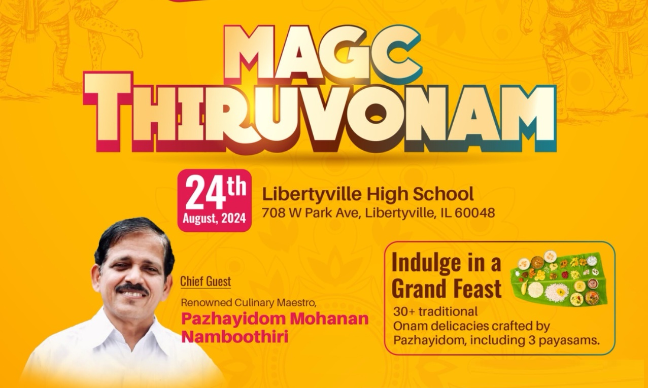 ഷിക്കാഗോ: MAGC, Malayalee Association of Greater Chicago യുടെ 2024 ഓണാഘോഷ പരിപാടികൾ ആഗസ്റ്റ് 24ആം തീയതി ശനിയാഴ്ച്ച ലിബർട്ടിവിൽ ഹൈസ്കൂളിൽ വച്ച് നടത്തപ്പെടുന്നു. പാചക കുലപതി ശ്രീ പഴയിടം മോഹനൻ നമ്പൂതിരി മുഖ്യാതിഥിയായി എത്തുന്ന ആഘോഷപരിപാടികളിൽ, അദ്ദേഹത്തിന്റെ രുചിവിസ്മയം ഷിക്കാഗോ മലയാളികൾക്ക് നേരിട്ടനുഭവിക്കാൻ അവസരമൊരുക്കിക്കൊണ്ട് 30 ലധികം വിഭവങ്ങളും 3 പായസവും അടങ്ങിയ സമൃദ്ധമായ സദ്യക്കുള്ള ഒരുക്കങ്ങൾ നടന്നുകൊണ്ടിരിക്കുന്നു. പരിപാടിയോടനുബന്ധിച്ച് മിഡ് വെസ്റ്റിലെ പ്രഗത്ഭരായ കലാകാരൻമാർ അണിയിച്ചൊരുക്കുന്ന കലാസായാഹ്നവും ആഘോഷങ്ങൾക്ക് മാറ്റ് കൂട്ടും. ആഗസ്റ്റ് 24 വരെ നീണ്ടുനില്ക്കുന്ന റീൽ ചലെഞ്ച് പോലുള്ള വിവിധ മത്സര പരിപാടികളും ഇതിനോടൊപ്പം സംഘടിപ്പിക്കുന്നുണ്ട്. സദ്യയുടെ പന്തി തിരഞ്ഞെടുക്കൽ, മറ്റ് ആഘോഷപരിപാടികളെ സംബന്ധിച്ച വിവരങ്ങൾ, സമയക്രമം തുടങ്ങിയവ MAGC വെബ്സൈറ്റായ www.magconline.com ൽ ലഭ്യമാണ്. MAGCയുടെ 10ആം വാർഷികത്തോടനുബന്ധിച്ചുള്ള ഈ ബൃഹത്തായ ഓണാഘോഷ പരിപാടികളിലേക്ക് എല്ലാ ഷിക്കാഗോ മലയാളികളെയും ഹൃദയപൂർവം ക്ഷണിക്കുന്നതായി പ്രസിഡന്റ് സുശീൽ വരയില്ലം, കമ്മറ്റി അംഗങ്ങളായ ഷൈലേഷ് മേനോൻ, മണികണ്ഠൻ ചന്ദ്രൻ, സ്വപ്ന വേണുഗോപാൽ, രണൺദീപ് രഘു എന്നിവർ അറിയിച്ചു.