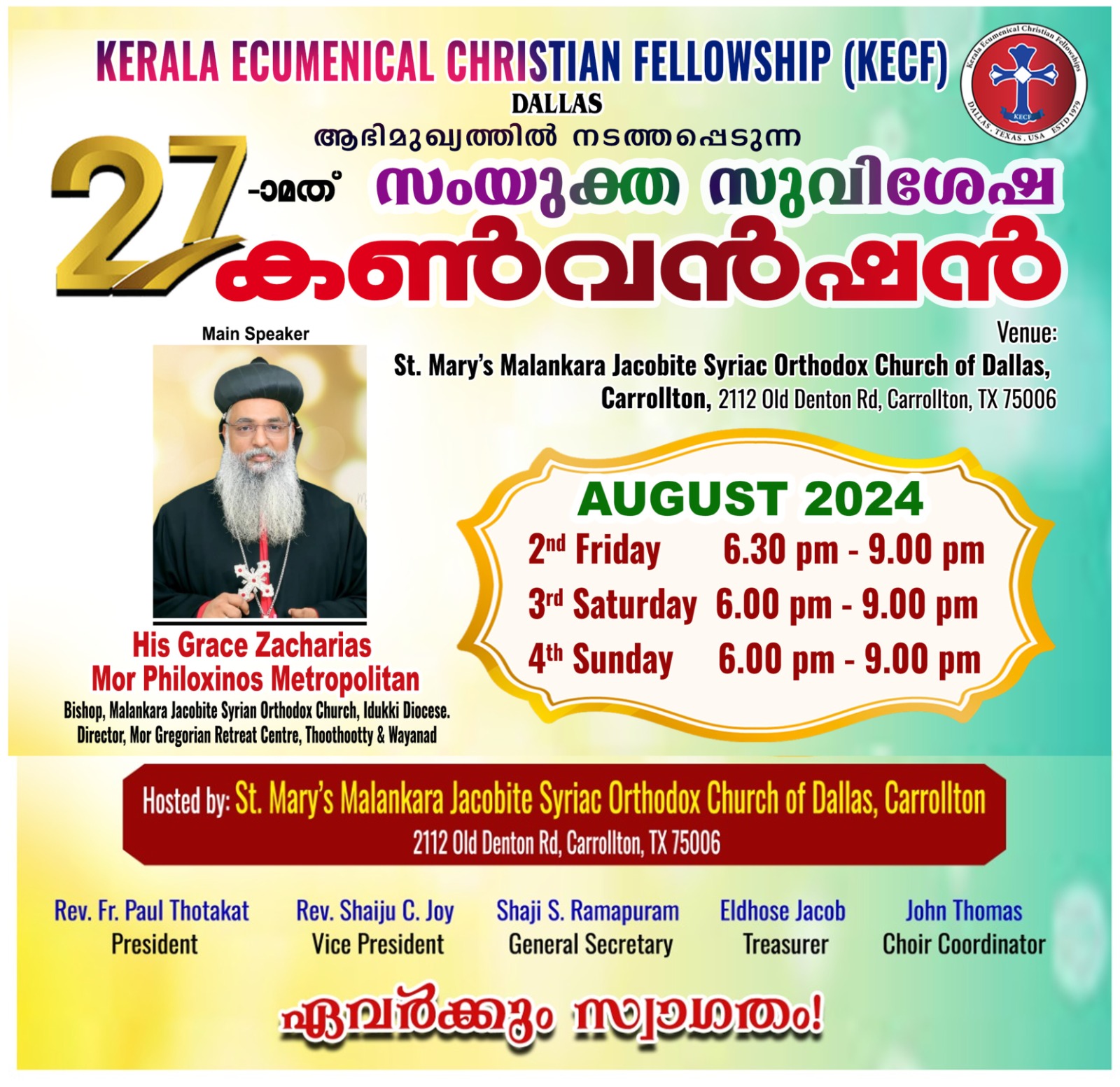 ഡാളസ്: കേരള എക്യുമെനിക്കല് ഫെലോഷിപ്പിന്റെ (KECF) ആഭിമുഖ്യത്തില് ഇരുപത്തിഏഴാംമത് സംയുക്ത സുവിശേഷ കണ്വെന്ഷന് നാളെ ( വെള്ളി ) ഡാളസിലെ കരോൾട്ടണിലുള്ള സെന്റ് മേരീസ് മലങ്കര യാക്കോബായ സിറിയൻ ഓര്ത്തഡോക്സ് ദേവാലയത്തിൽ വെച്ച് (2112, Old Denton Rd, Carrollton, TX 75006) തുടക്കം കുറിക്കും.